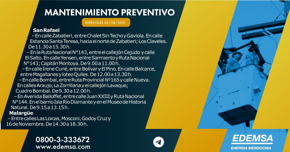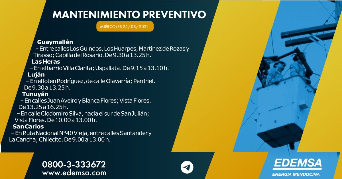 La Institución ha informado el cronograma de cortes de energía que pondrá en acción hoy, miércoles 26 de agosto, en su cuenta oficial de Twitter. Las interrupciones se producirán, en este caso, en siete departamentos mendocinos: Guaymallén, Las Heras, Luján de Cuyo, Tunuyán, San Carlos, San Rafael y Malargüe, y serán para realizar mantenimiento preventivo.