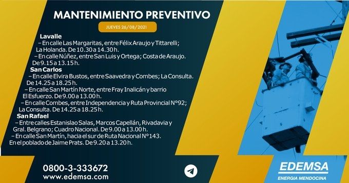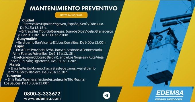 Foto: ALF PONCE MERCADO / MDZLa Institución ha informado el cronograma de cortes de energía que pondrá en acción hoy, jueves 26 de agosto, en su cuenta oficial de Twitter. Las interrupciones se producirán, en este caso, en ocho departamentos mendocinos: Ciudad, Guaymallén, Maipú, Luján de Cuyo, Tunuyán, Lavalle, San Carlos y San Rafael; y serán para realizar mantenimiento preventivo.