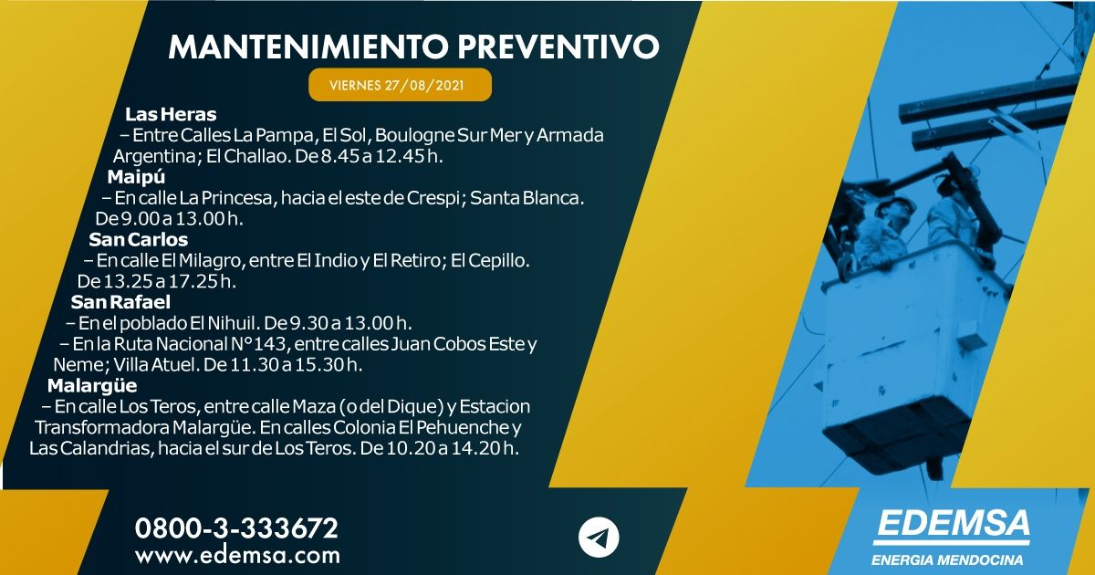 La Institución ha informado el cronograma de cortes de energía que pondrá en acción hoy, viernes 27 de agosto, en su cuenta oficial de Twitter. Las interrupciones se producirán, en este caso, en cinco departamentos mendocinos: Las Heras, Maipú, San Carlos, San Rafael y Malargüe; y serán para realizar mantenimiento preventivo.