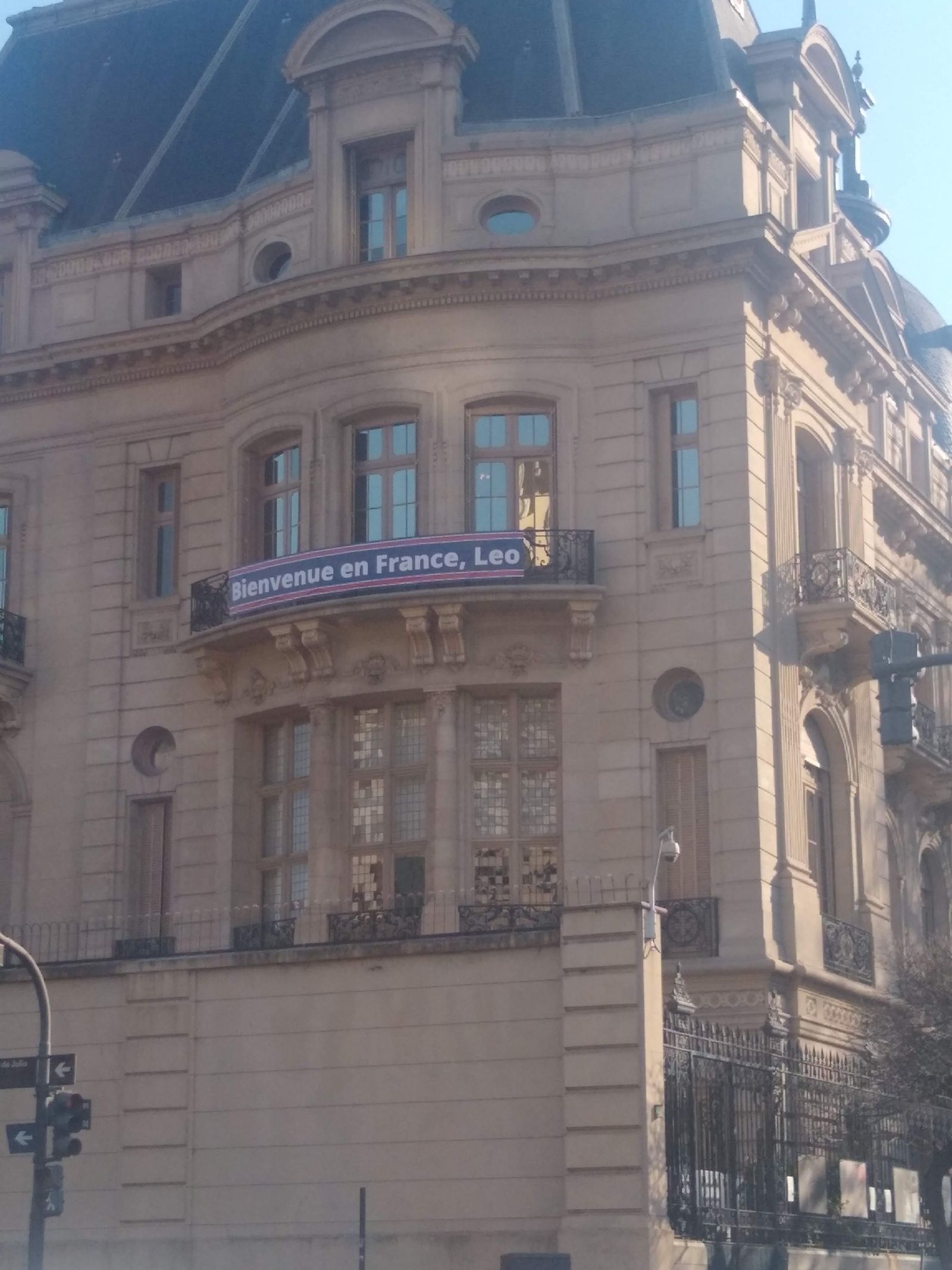“Bienvenue en France, Leo” se lee al pasar por la Avenida 9 de Julio. Esta tarde la embajada de Francia en Argentina colgó una bandera en su balcón con vista a la famosa avenida de Buenos Aires donde le da la bienvenida al campeón de América.