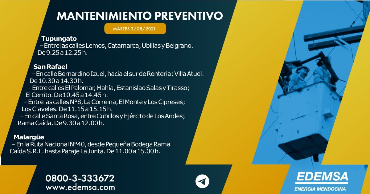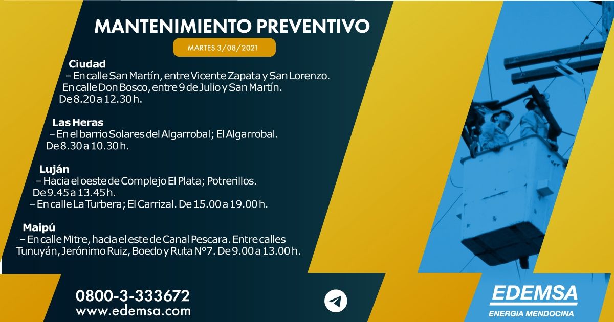 La Institución ha informado el cronograma de cortes de energía que pondrá en acción hoy, martes 3 de agosto, en su cuenta oficial de Twitter. Las interrupciones se producirán, en este caso, en siete departamentos mendocinos: Ciudad, Las Heras, Luján de Cuyo, Maipú, Tupungato, San Rafael y Malargüe; y serán para realizar mantenimiento preventivo.