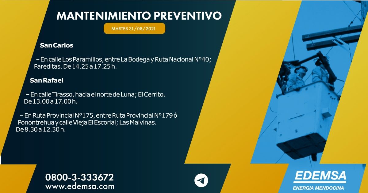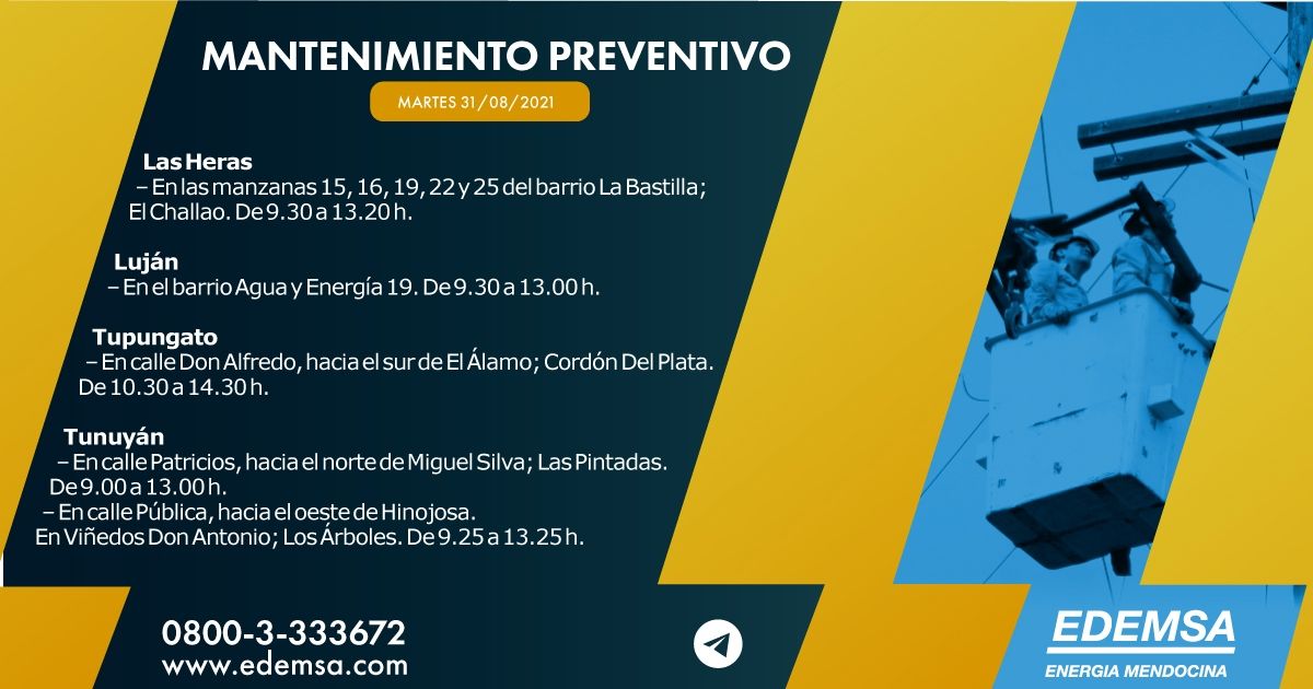 Foto: ALF PONCE MERCADO / MDZLa Institución ha informado el cronograma de cortes de energía que pondrá en acción hoy, martes 31 de agosto, en su cuenta oficial de Twitter. Las interrupciones se producirán, en este caso, en seis departamentos mendocinos: Las Heras, Luján de Cuyo, Tupungato, Tunuyán, San Carlos y San Rafael; y serán para realizar mantenimiento preventivo.