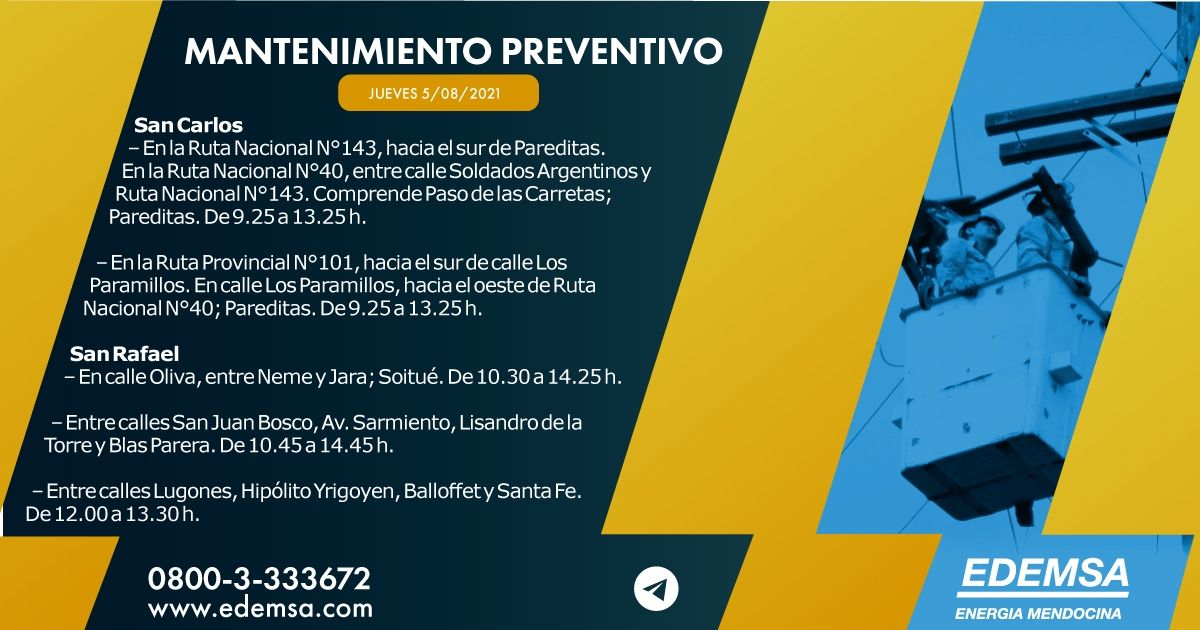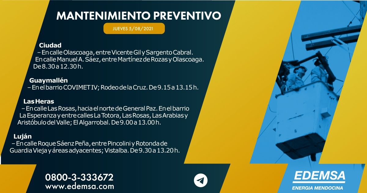 La Institución ha informado el cronograma de cortes de energía que pondrá en acción hoy, jueves 5 de agosto, en su cuenta oficial de Twitter. Las interrupciones se producirán, en este caso, en siete departamentos mendocinos: Ciudad, Guaymallén, Las Heras, Luján de Cuyo, San Carlos y San Rafael; y serán para realizar mantenimiento preventivo.