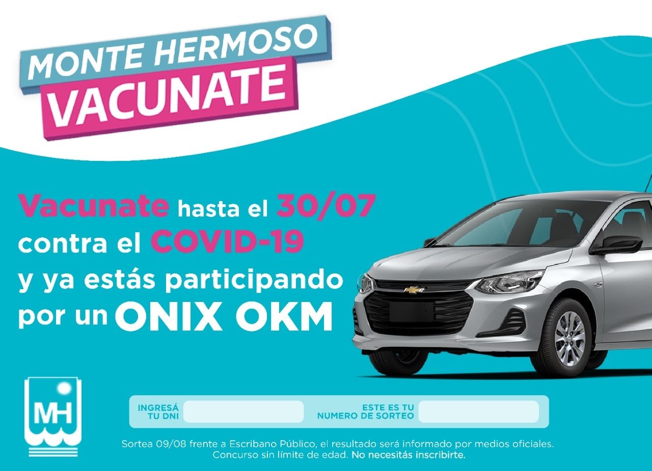 El anuncio lo hicieron las autoridades del partido esta mañana: "Quienes se hayan vacunado contra la covid-19 hasta el 30 de julio en la ciudad podrán consultar su número de orden para participar del sorteo de un Onix cero kilómetro mediante la página sorteo.montehermoso.gov.ar".