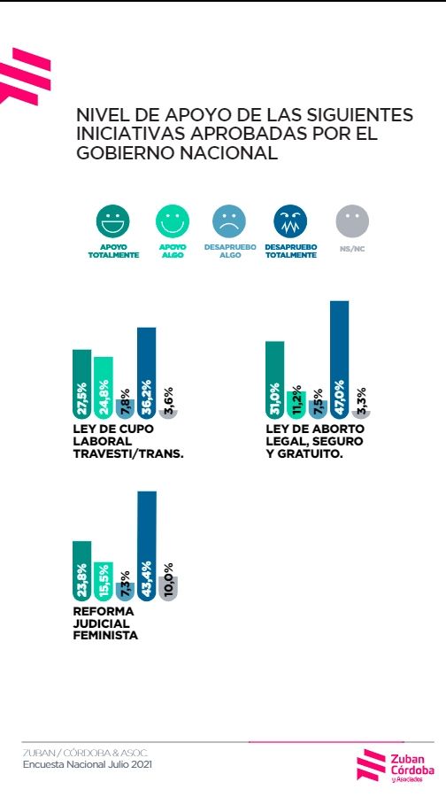 Eso mismo se vio reflejado en una encuesta reciente de Zuban y Asociados que arrojó una creciente desaprobación de los jóvenes de 16 a 30 años respecto a un grupo de leyes impulsadas por el gobierno de Alberto Fernández, entre las que figuran la ley de aborto con un rechazo del 54,5%.