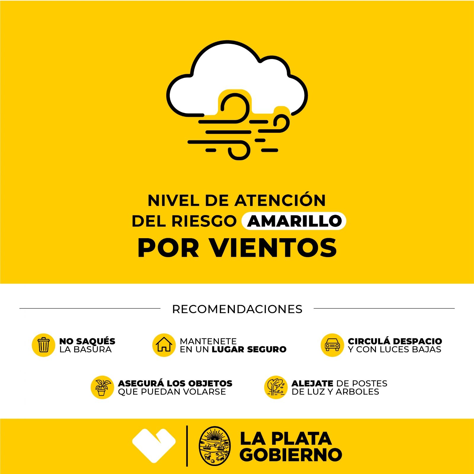 Con este pronóstico, desde el gobierno local recomendaron a los ciudadanos evitar la circulación en la vía pública, no tocar cables o postes de luz y retirar macetas u otros objetos que puedan volarse de balcones y ventanas debido a las fuertes ráfagas de viento. También aconsejaron seguir la información de los canales oficiales del gobierno y recordaron los teléfonos ante emergencias en la ciudad.