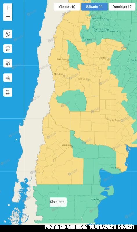 El pronóstico de Mendoza para el sábado 11 de septiembre indica cielo algo nublado o parcialmente nublado con una temperatura mínima de 9º y una máxima de 26º. Además, el Servicio Meteorológico emitió un alerta amarillo por fuertes vientos para la mañana, tarde y noche del sábado, que afectará principalmente al área cordillerana (Las Heras, Luján de Cuyo y Cordillera de Tupungato).