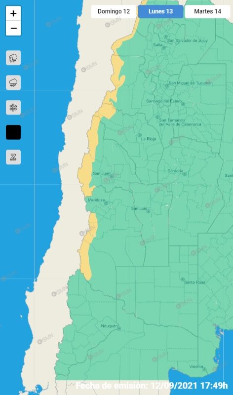 El SMN mantiene también para el lunes un alerta por vientos intensos en la zona cordillerana de Salta, Jujuy, Catamarca, La Rioja, San Juan y Mendoza. Por ahora es de nivel amarillo, por lo que no se espera que cause inconveniente a las personas.