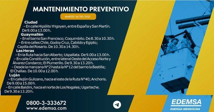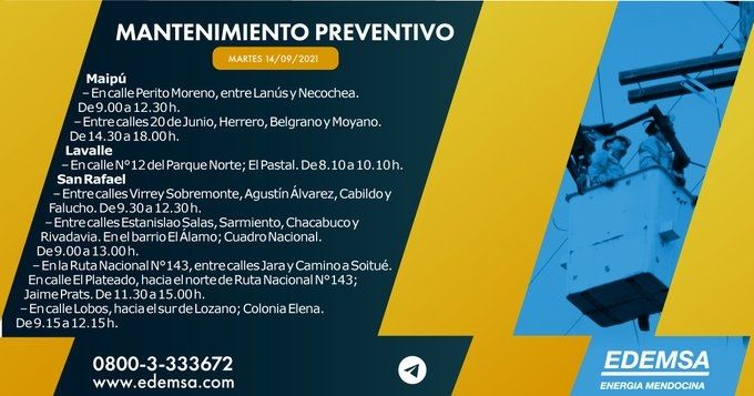 La Institución ha informado el cronograma de cortes de energía que pondrá en acción hoy, martes 14 de septiembre, en su cuenta oficial de Twitter. Las interrupciones se producirán, en este caso, en seis departamentos mendocinos: Ciudad, Guaymallén, Las Heras, Luján de Cuyo, Maipú, Lavalle y San Rafael; y serán para realizar mantenimiento preventivo.