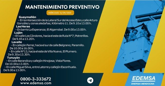 La Institución ha informado el cronograma de cortes de energía que pondrá en acción hoy, miércoles 15 de septiembre, en su cuenta oficial de Twitter. Las interrupciones se producirán, en este caso, en siete departamentos mendocinos: Guaymallén, Las Heras, Luján de Cuyo, Lavalle, Tunuyán, San Carlos y San Rafael, y serán para realizar mantenimiento preventivo.