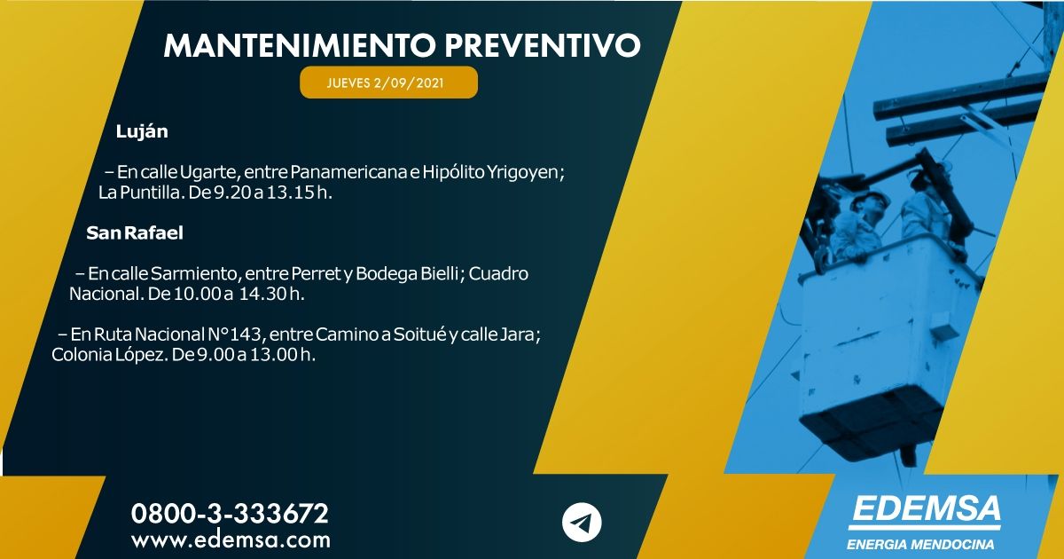 La Institución ha informado el cronograma de cortes de energía que pondrá en acción hoy, jueves 2 de septiembre, en su cuenta oficial de Twitter. Las interrupciones se producirán, en este caso, en dos departamentos mendocinos: Luján de Cuyo y San Rafael; y serán para realizar mantenimiento preventivo.