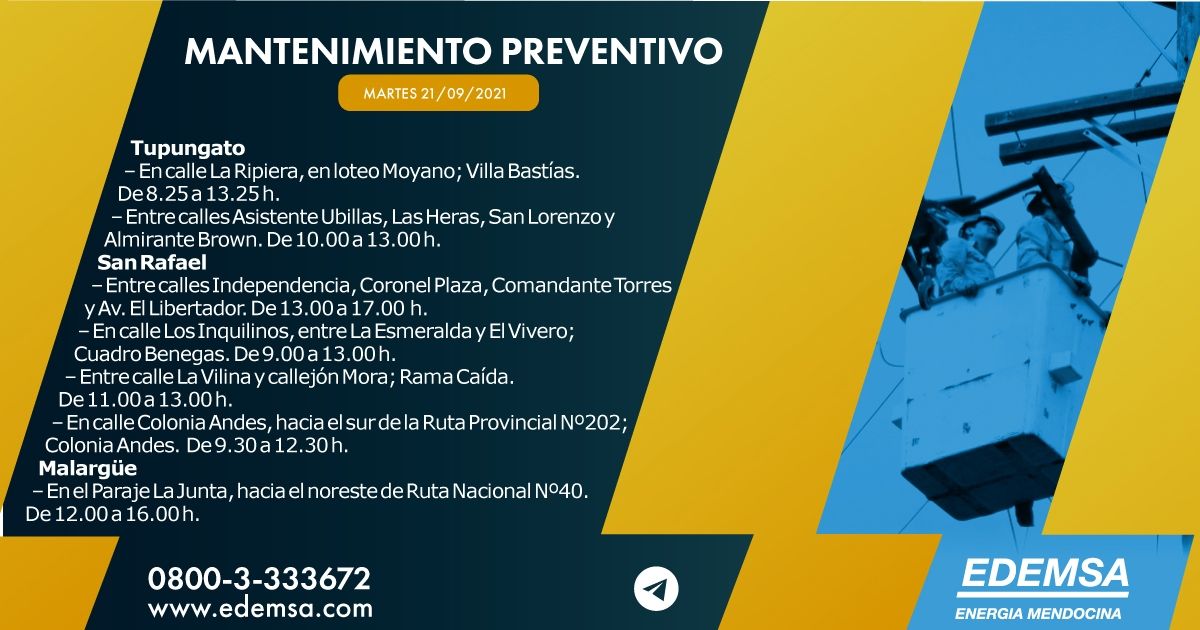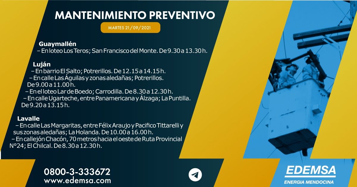 ALF PONCE MERCADO / MDZLa Institución ha informado el cronograma de cortes de energía que pondrá en acción hoy, martes 21 de septiembre, en su cuenta oficial de Twitter. Las interrupciones se producirán, en este caso, en seis departamentos mendocinos: Guaymallén, Luján de Cuyo, Lavalle, Tupungato, San Rafael y Malargüe; y serán para realizar mantenimiento preventivo.
