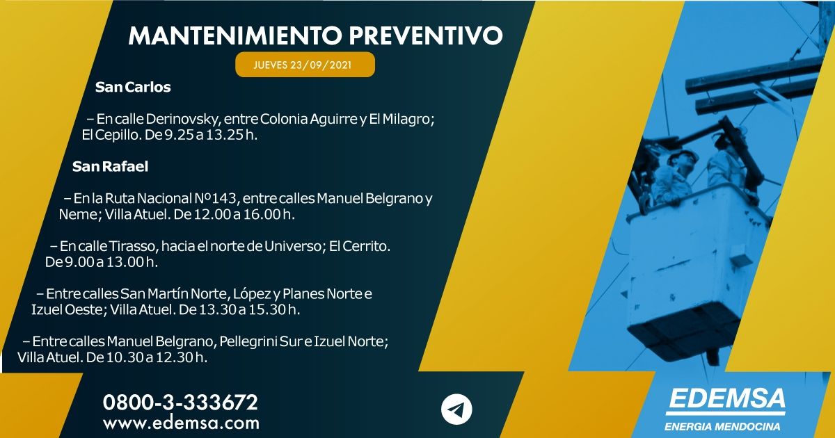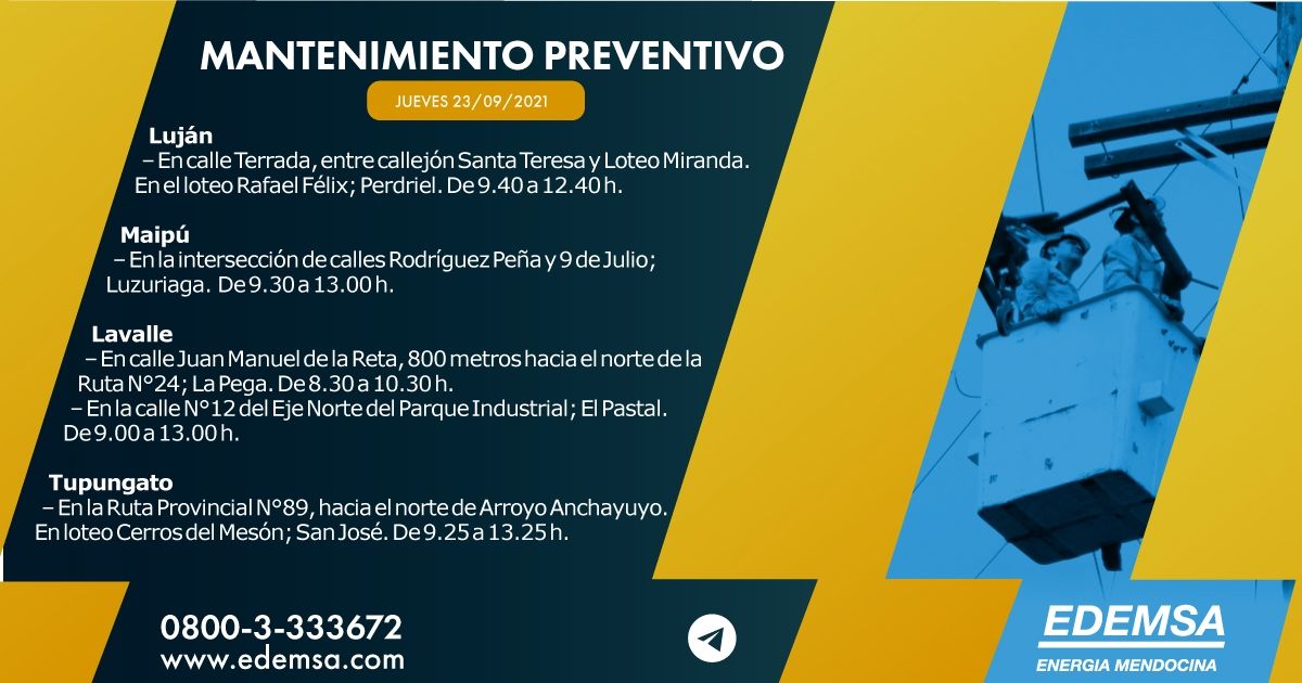 La Institución ha informado el cronograma de cortes de energía que pondrá en acción hoy, jueves 23 de septiembre, en su cuenta oficial de Twitter. Las interrupciones se producirán, en este caso, en seis departamentos mendocinos: Maipú, Luján de Cuyo, Lavalle, Tupungato, San Carlos y San Rafael; y serán para realizar mantenimiento preventivo.