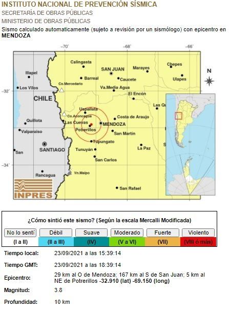 Minutos antes de las 15:40 se registró un temblor en Mendoza. Según informó el Instituto Nacional de Prevención Sísmica (Inpres), el movimiento sísmico tuvo una magnitud de 3.8.