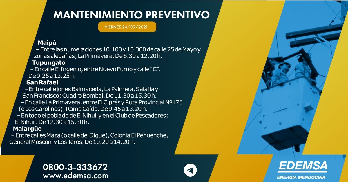 La Institución ha informado el cronograma de cortes de energía que pondrá en acción hoy, viernes 24 de septiembre, en su cuenta oficial de Twitter. Las interrupciones se producirán, en este caso, en cuatro departamentos mendocinos: Maipú, Tupungato, San Rafael y Malargüe, y serán para realizar mantenimiento preventivo.