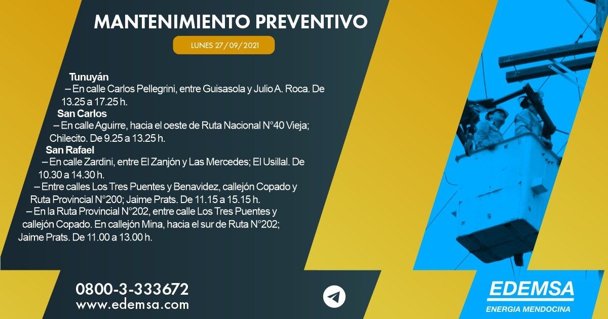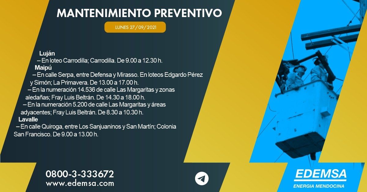 Las interrupciones se producirán, en este caso, en seis departamentos mendocinos: Luján de Cuyo, Maipú, Lavalle, Tunuyán, San Carlos y San Rafael y serán para realizar mantenimiento preventivo.