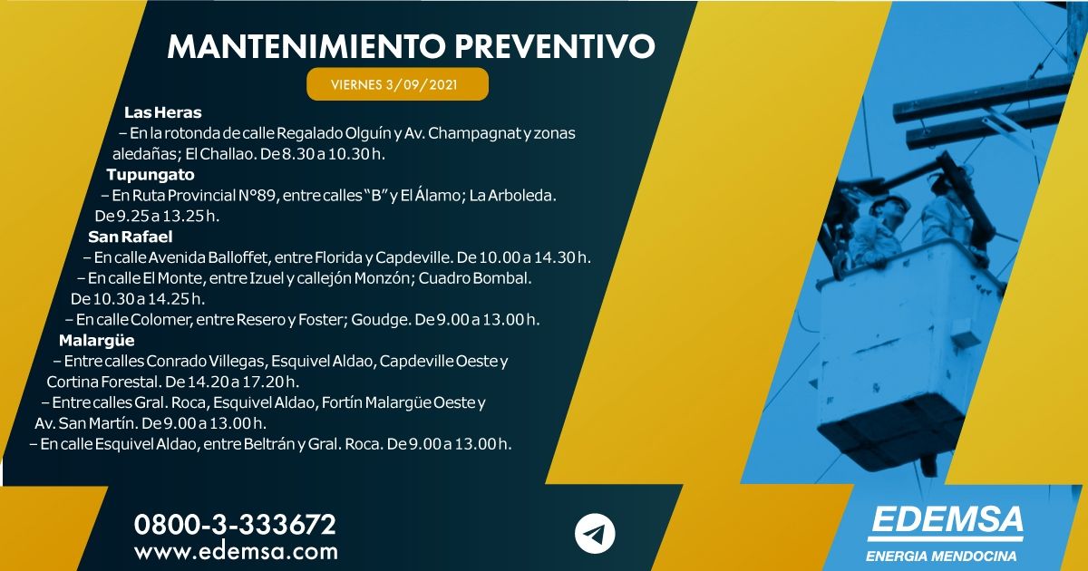 La Institución ha informado el cronograma de cortes de energía que pondrá en acción hoy, viernes 3 de septiembre, en su cuenta oficial de Twitter. Las interrupciones se producirán, en este caso, en cuatro departamentos mendocinos: Las Heras, Tupungato, San Rafael y Malargüe, y serán para realizar mantenimiento preventivo.