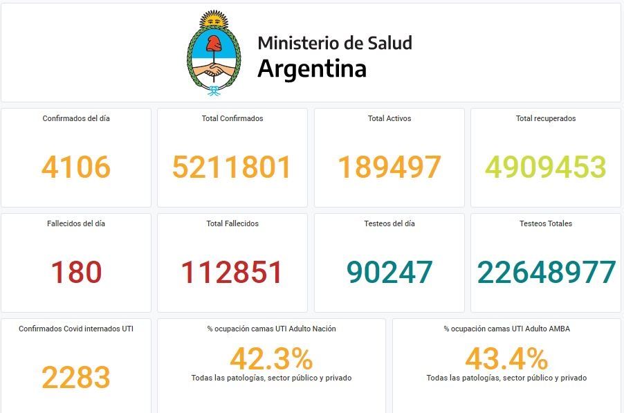 También se informó que fueron realizados 90.247 testeos y desde el inicio del brote se acumularon 22.648.977 pruebas diagnósticas para esta enfermedad.
