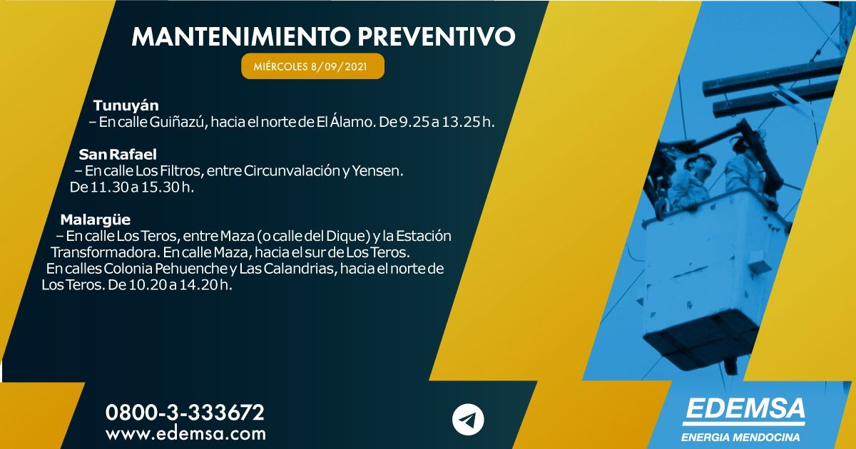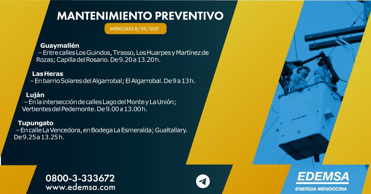 La Institución ha informado el cronograma de cortes de energía que pondrá en acción hoy, miércoles 8 de septiembre, en su cuenta oficial de Twitter. Las interrupciones se producirán, en este caso, en siete departamentos mendocinos: Guaymallén, Las Heras, Luján de Cuyo, Tupungato, Tunuyán, San Rafael y Malargüe; y serán para realizar mantenimiento preventivo.