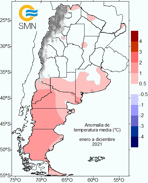 En el 2021, la región que más sintió el incremento de las temperaturas fue Patagonia, que finalizó con una anomalía de temperatura promedio de +1.1°C. Con este valor se quebró por varias décimas de grado el récord histórico de calor, que era de +0.77°C (1998).