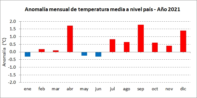 Finalmente, hubo solo 3 meses que cerraron con temperaturas levemente inferiores a las normales en el país: enero, mayo y junio. El resto fueron meses cálidos y es necesario remarcar las anomalías extremadamente cálidas registradas en abril, septiembre y diciembre.