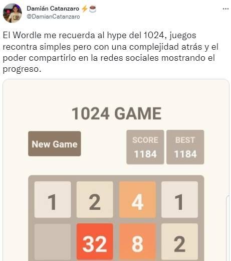 Algunos, como Damián Catanzaro -creador de Cafecito- recordaron otros juegos que también causaron furor. Uno de ellos, el que él mismo citó con una captura de pantalla, es el 1024. "El Wordle me recuerda al hype del 1024, juegos recontra simples pero con una complejidad atrás y el poder compartirlo en la redes sociales mostrando el progreso", aseguró.