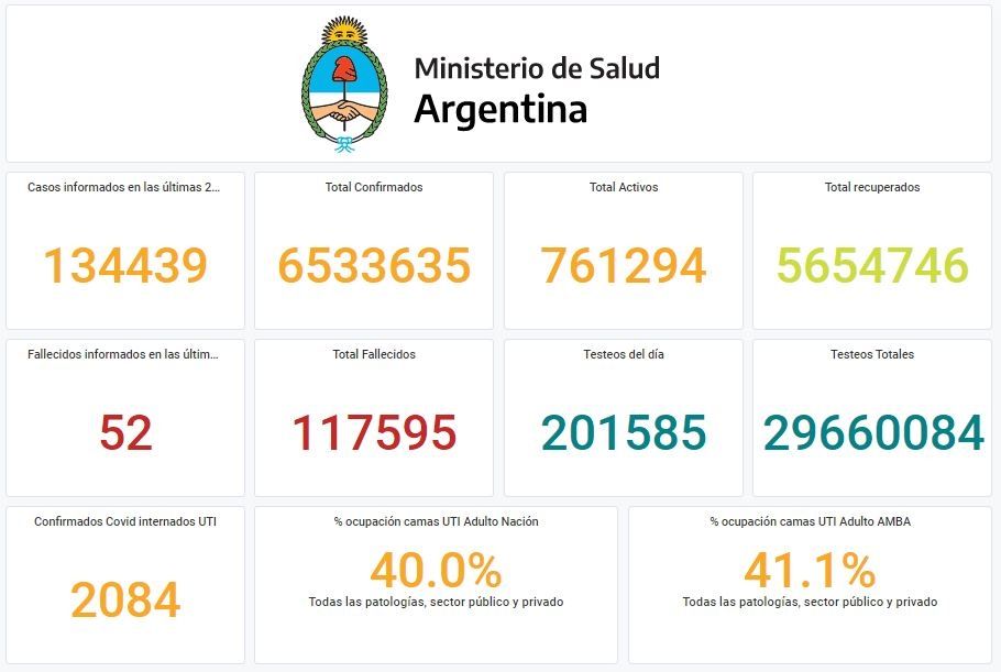 Argentina notificó este martes 134.439 nuevos casos de coronavirus en las últimas 24 horas, de acuerdo a la información brindada por el Ministerio de Salud de la Nación. El porcentaje de positividad fue del 66%.