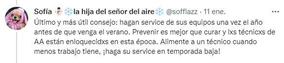 "Ya leí muchos tuits sobre personas que apagan el aire acondicionado porque tienen frío y hacen sufrir a convivientes. Como hija de 'el del aire' les voy a dar unos tips para que disfruten la experiencia y además cuiden a sus máquinas y alarguen su vida útil", dijo en el primero de un larga serie de tuits destinados a ayudar a las personas a disfrutar más del aire acondicionado.