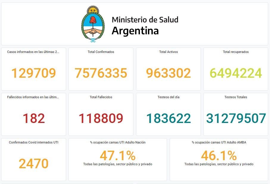 Argentina notificó este jueves 129.709 nuevos casos de coronavirus en las últimas 24 horas, de acuerdo a la información brindada por el Ministerio de Salud de la Nación.