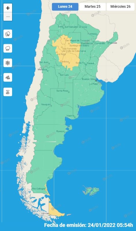 Para mañana, martes 25 de enero, también se esperan fuertes tormentas para el norte de la provincia de Córdoba, parte del sur de la provincia de Santa Fe y oeste de la provincia de Santiago del Estero. En toda esta área se ha emitido alerta amarillo.