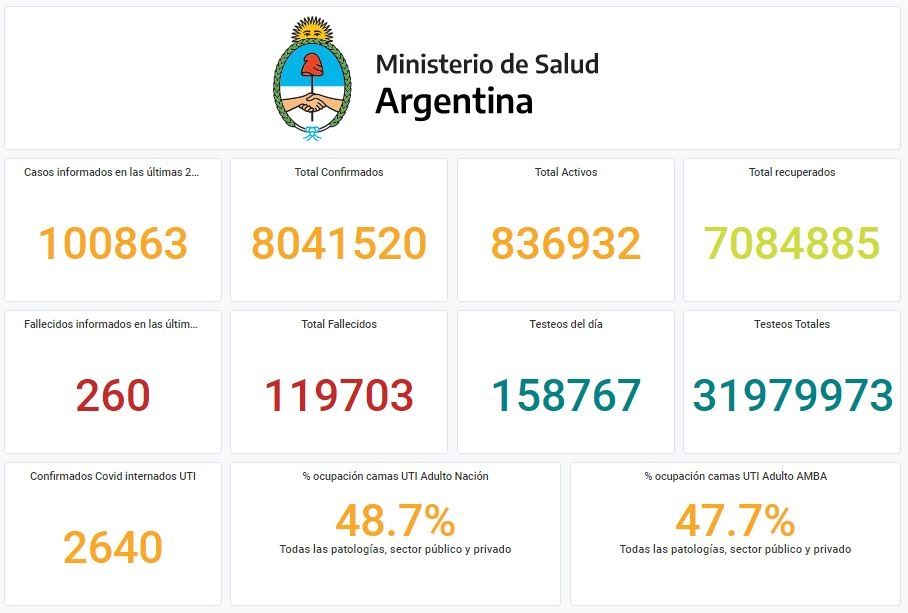 También se informó que fueron realizados 158.767 testeos y desde el inicio del brote se acumularon 31.979.973 pruebas diagnósticas para esta enfermedad.