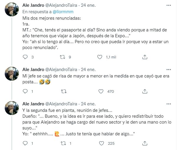 El tweet lleva actualmente más de 300 citados y 300 retweets y casi 20 mil me gusta. Obviamente, como era de prever, los comentarios se llenaron de usuarios comentando anécdotas y maneras que tienen de renunciar, y hay algunas que parecen sacadas de una película.