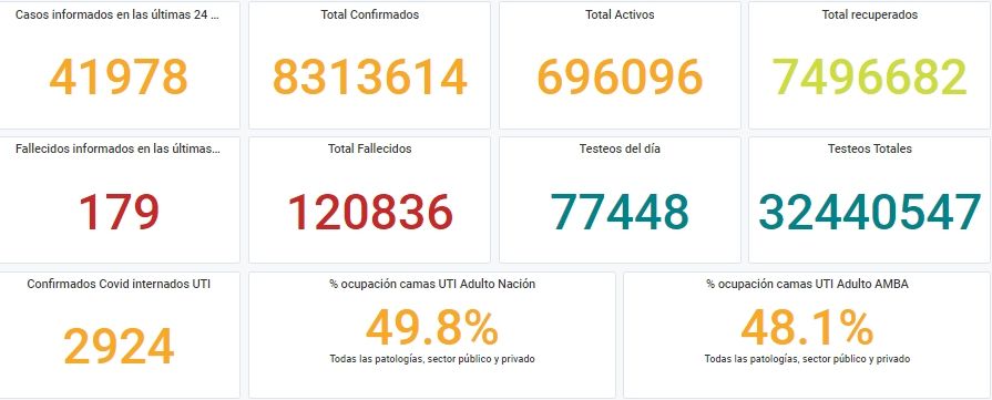 El Gobierno notificó este sábado 41.978 nuevos casos de coronavirus en las últimas 24 horas, de acuerdo a la información brindada por el Ministerio de Salud de la Nación. Además, se reportaron 179 fallecidos. De esta manera, continúa la tendencia en el descenso de contagios (más de 20.000 casos menos que ayer) y también en la cantidad de fallecidos (ayer se registraron 305).