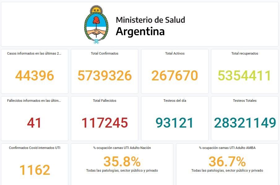Argentina notificó este lunes 44.396 nuevos casos de coronavirus en las últimas 24 horas, de acuerdo a la información brindada por el Ministerio de Salud de la Nación.