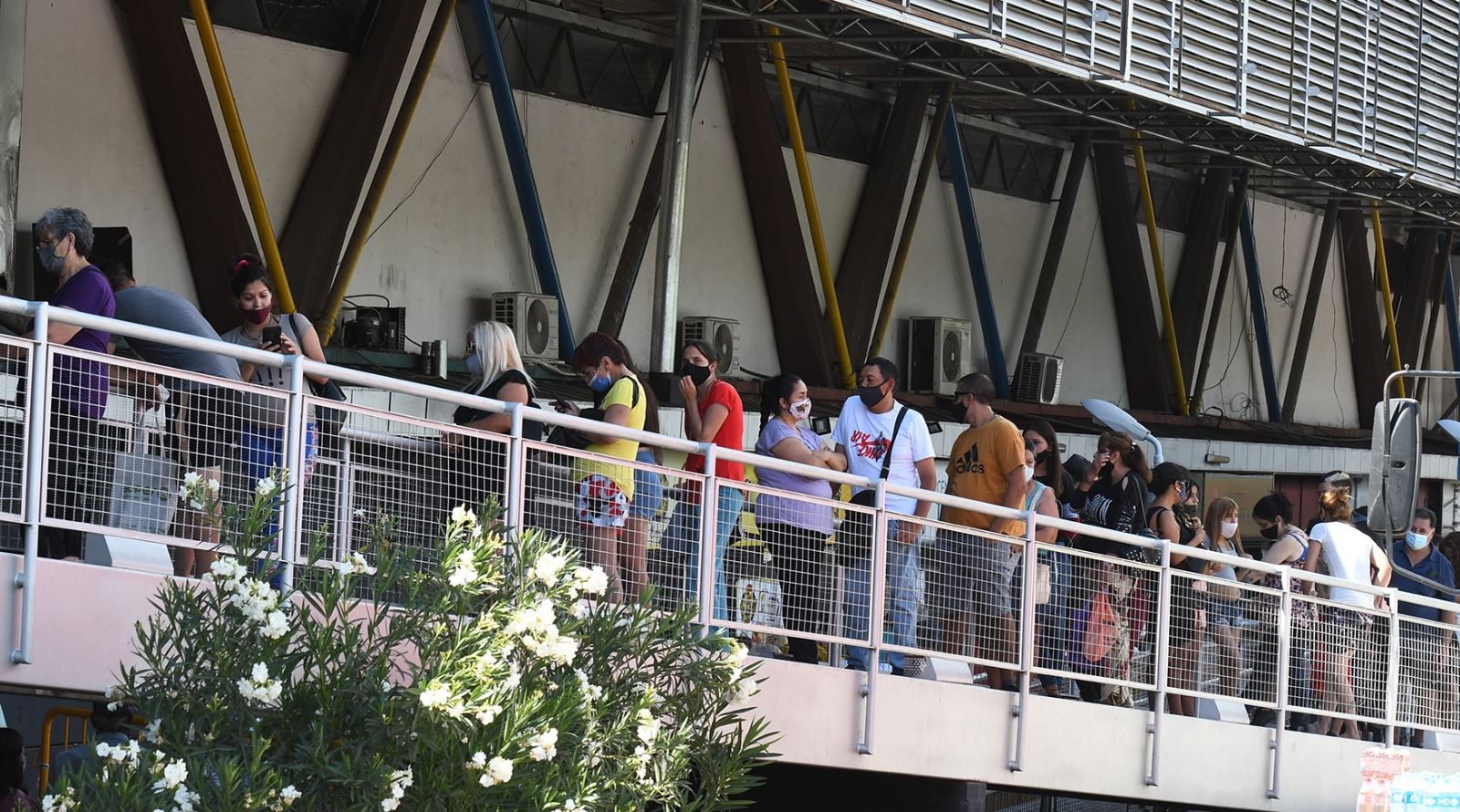 En la Terminal de Ómnibus de Mendoza funciona otro de los puntos de testeo de covid-19. Allí la situación es muy similar al resto de los puntos, la fila daba toda la vuelta al edificio, el distanciamiento social parecía no tenerse en cuenta y el agobiante calor hacía que la ansiedad creciera entre las personas que querían hisoparse.