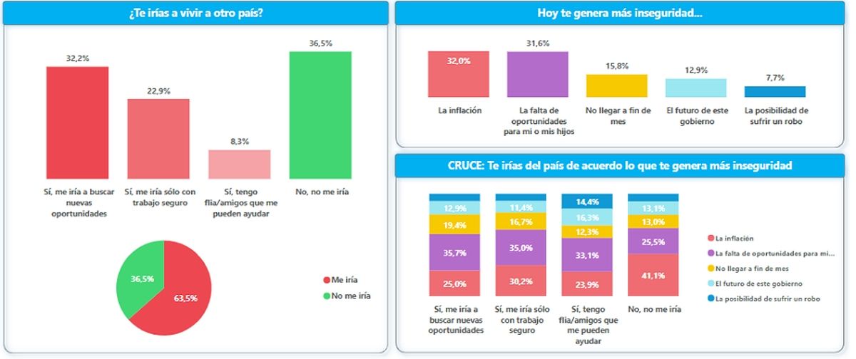 La encuesta detalló también los motivos por los que los argentinos se irían del país y, en primer lugar, figura la inflación seguida "por la falta de oportunidades para mí o para mis hijos", mientras que en tercer lugar aparece "por no llegar a fin de mes". También figuran entre los motivos "el futuro de este Gobierno" y "la posibilidad de sufrir un robo".