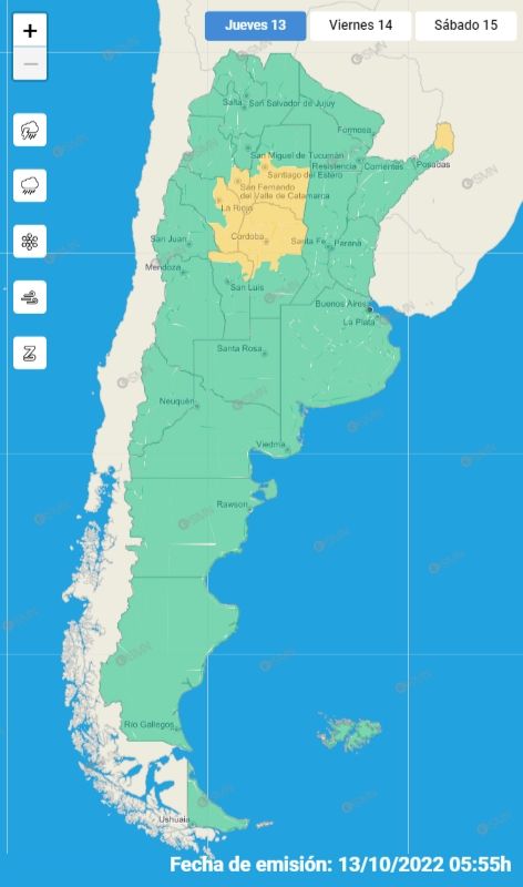 Santiago del Estero, San Luis, La Rioja, Córdoba y Catamarca son las provincias bajo alerta amarilla por viento. Según señala el SMN, el área será afectada por un brusco cambio de vientos al sector sur, con velocidades entre 35 y 50 km/h, y ráfagas que pueden superar los 70 km/h.