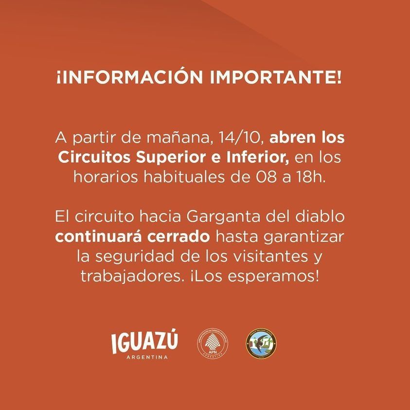 En cuanto a la reapertura del Parque Iguazú, quienes hayan adquirido de manera anticipada las entradas podrán utilizarlas en cualquier momento. Lo mismo para aquellos visitantes que el miércoles debieron abandonar el parque ante la decisión de la clausura preventiva.