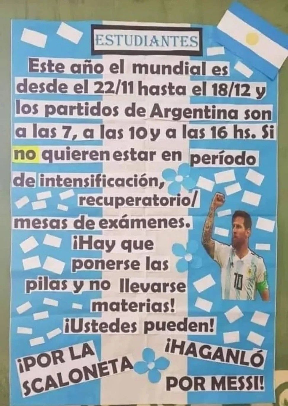 Por último, los creadores del cartel buscaron llegar a sus alumnos a través de la emoción y la pasión, acompañado de una foto de Lionel Messi. “¡Por la Scaloneta! ¡Hánganlo por Messi!", finaliza el mensaje.