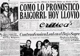 Y como “cosa e’ mandinga” o por obra científica de la máquina de Baigorri, la madrugada del 3 de enero la lluvia inundó Buenos Aires. La multitud como en “cantando bajo la lluvia” de Gene Kelly vitoreaba a Baigorri Velar apodado el “Júpiter moderno” quien consiguió lo que ni una mágica cumbre de divinidades como Zeus el dueño de las nubes griegas, Tlaloc dios de la lluvia azteca, Illapa la celebridad inca director de todos los truenos del Tahuantinsuyo y San Isidro el santo cristiano de los chubascos al son de una danza de lluvia Sioux pudieron haber hecho jamás con tanta precisión.