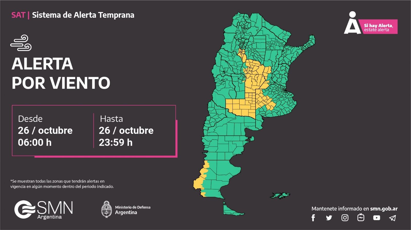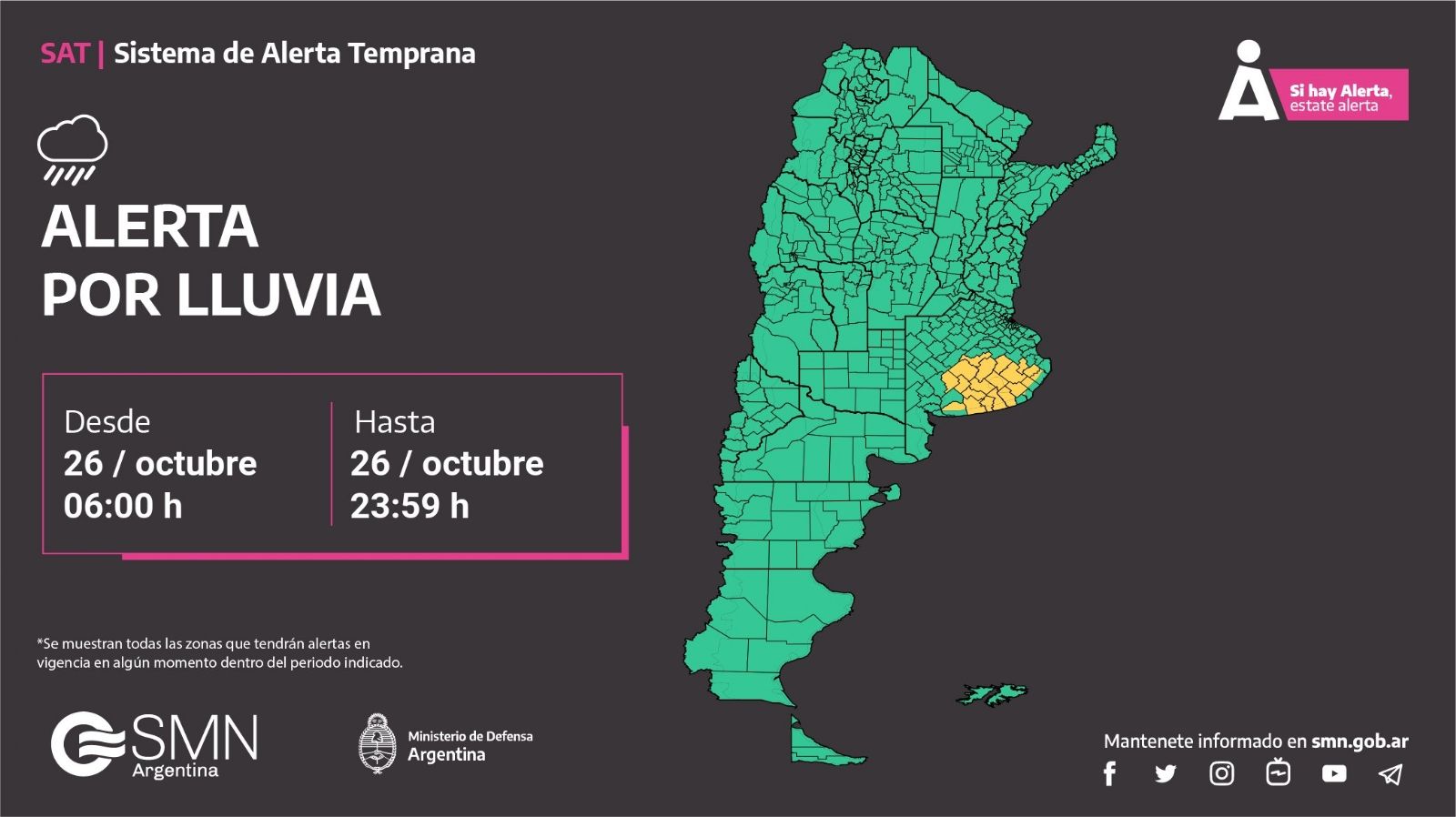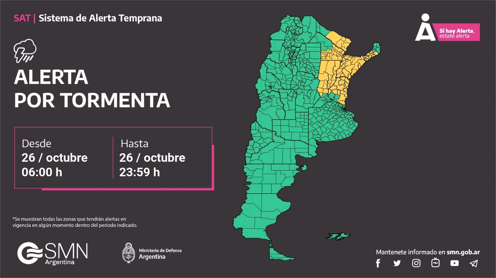 El Servicio Meteorológico Nacional (SMN), a través del Sistema de Alerta Temprana, advirtió acerca de eventos meteorológicos extremos en 12 provincias argentinas. Debido a esto lanzó alertas amarillas para Buenos Aires, Catamarca, Chaco, Córdoba, Corrientes, Entre Ríos, Formosa, La Pampa, Misiones, San Luis, Santa Cruz y Santa Fe.