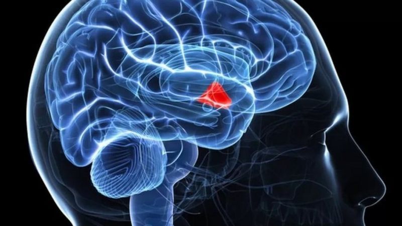 El hipotálamo (de color rojo en la ilustración) desempeña el papel de "termostato" del cuerpo humano.