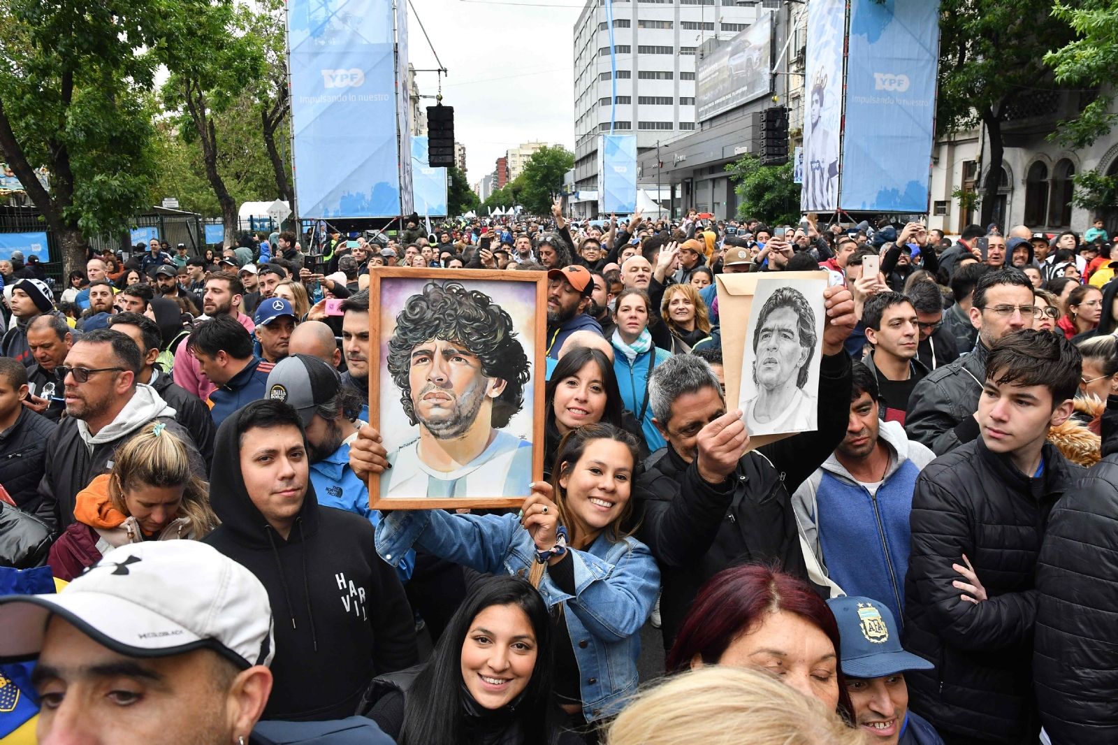 En los parlantes sonaban canciones alusivas a Diego como "La mano de Dios", de Rodrigo, o "Life is life", de Opus, aquella recordada canción que Maradona bailaba mientras hacía la entrada en calor con la pelota para encarar un partido del Napoli. Sobre toda la avenida se iban desplegando varias gigantografías con la cara de Diego y distintas frases como "Diego eterno", "Del potrero a la gloria" o "En este suelo hay fútbol".