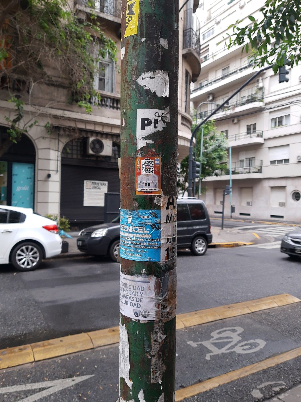 Calle Juncal casi esquina Uriburu, casi esquina Junín. Es una de esas manzanas de la capital de la Argentina donde el damero es imperfecto y los entendidos en geometría ahorran metros en sus caminatas. En esa "cuadra" de menos de 20 metros hay un poste de luz que llama la atención. No por lo sucio. No por sus panfletos pegados y despegados. Es que su acero (des)pintado de verde muestra el cromo más deseado del mono-tema de este año: el álbum del mundial Qatar 2022. Allí se puede ver una figurita en perfecto estado pegada: es la de Messi. Para sorpresa de quienes la detectan, la cara del 10 de la selección está reemplazada por un código QR.