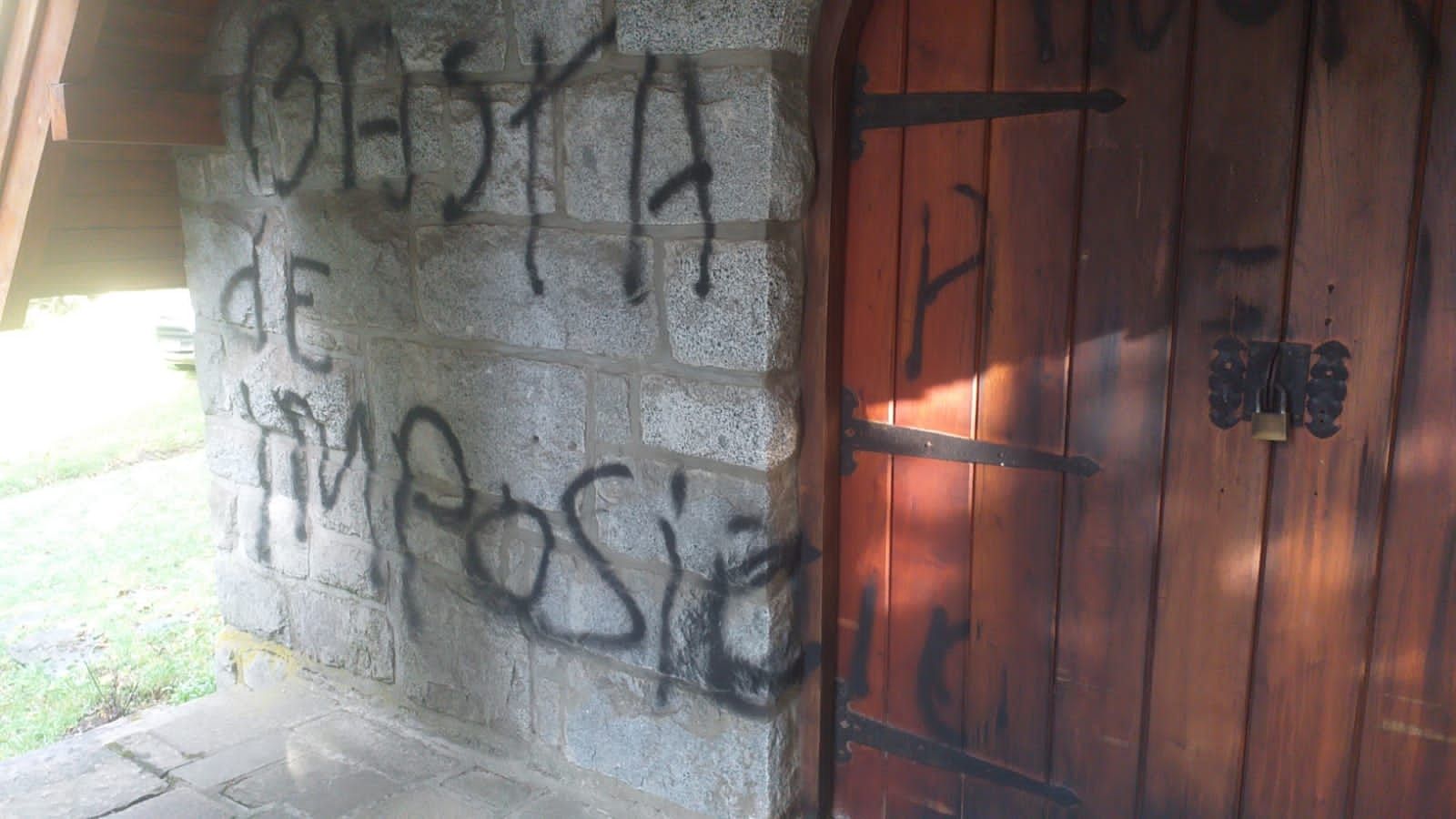 Este miércoles, la capilla De la Asunción y la parroquia de Villa La Angostura aparecieron pintadas a favor del reclamo mapuche. La situación se da en un tenso contexto por el desalojo ocurrido ayer por fuerzas federales en Villa Mascardi.