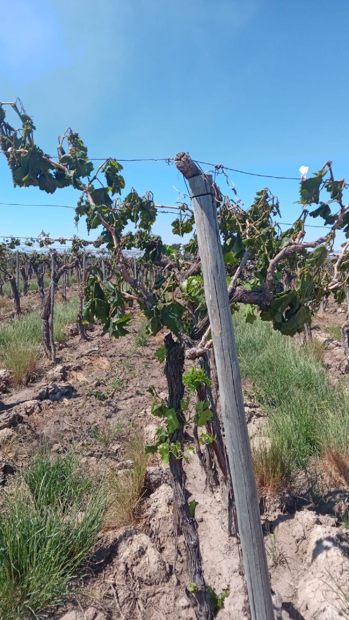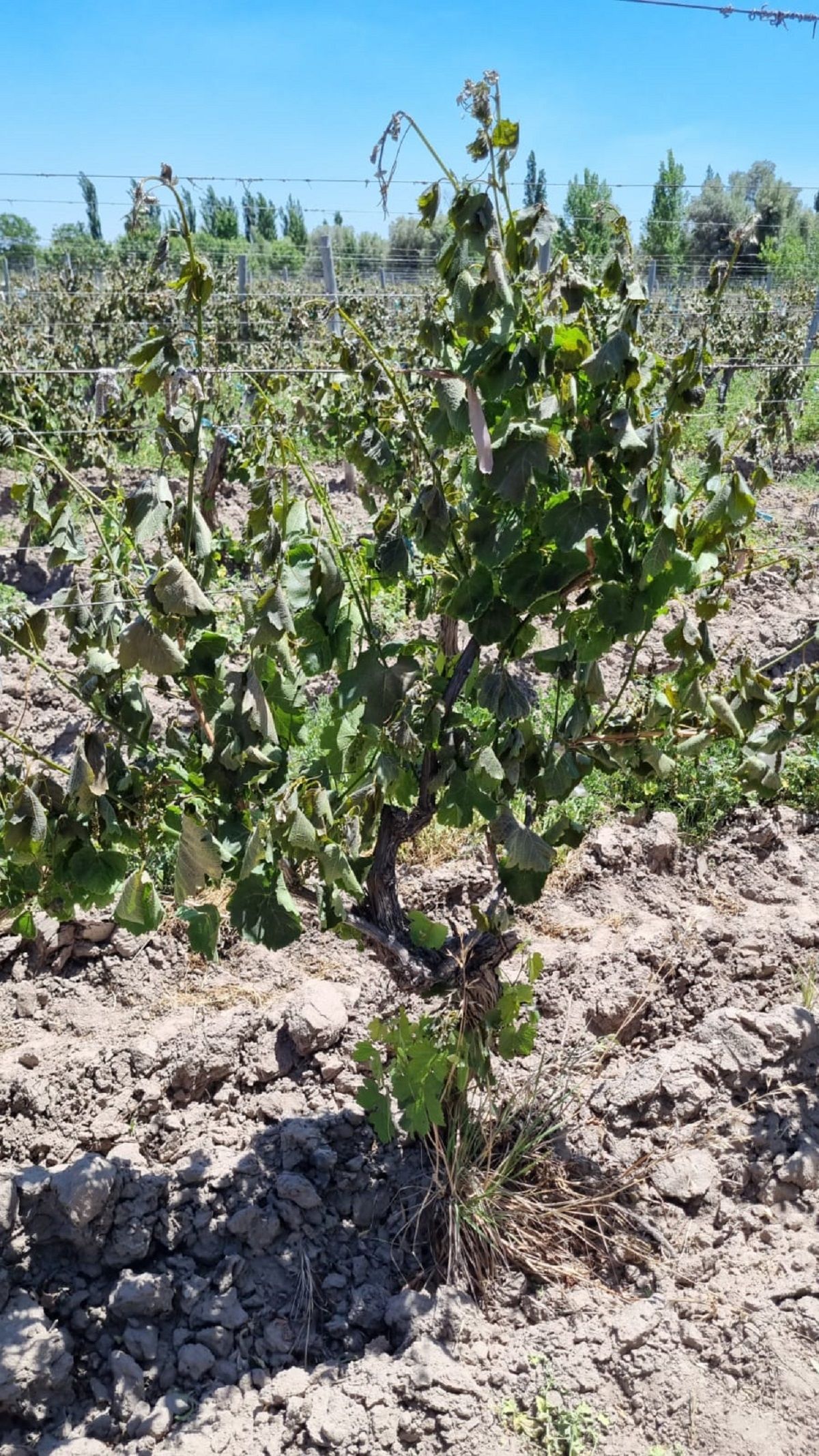 El 31 de marzo, sobre el din de la cosecha, se produjo una helada en Mendoza que afectó a gran parte del campo, justo en el momento en que los cultivos acumulan reservas para fortalecerse. Esa situación generó el primer indicio de debilitamiento en las hileras. Ahora cuando el ciclo de brotación estaba en su etapa inicial, el halo de aire helado hizo estragos en las plantaciones, sobre todo aquellas que no contaban con la suficiente humedad en la tierra como para frenar el impacto de la helada. González Antivilo explica que es por este motivo que la planta tendrá un crecimiento de hojas notorio para equilibrar su crecimiento vegetativo.