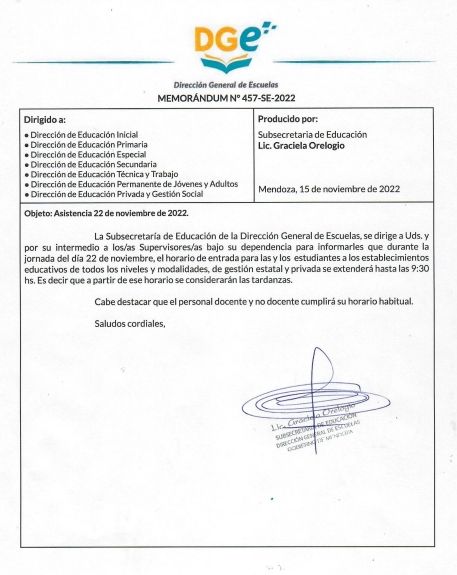 "La Subsecretaría de Educación de la Dirección General de Escuelas se dirige a ustedes y por su intermedio a los/las supervisores/as bajo su dependencia para informarles que durante la jornada del día 22 de noviembre, el horario de entrada para las y los estudiantes a los establecimientos educativos de todos los niveles y modalidades, de gestión estatal y privada se extenderás hasta las 9:30 hs. Es decir que a partir de ese horario se considerarán", precisaron desde la DGE a través de un comunicado.