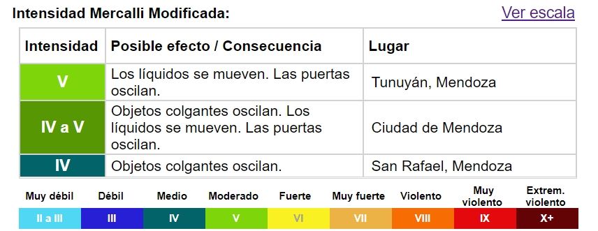 A través de la primera inspección, que se hace a través de la percepción de la gente, se determinó que en Tunuyán, Mendoza, fue de intensidad V, que corresponde a moderada. En ese caso los líquidos se mueven, las puertas y objetos colgantes oscilan. Precisamente en esa comuna del Valle de Uco sí adelantaron que había algunas roturas de tanques de agua, aunque sin mayores complicaciones por el momento.