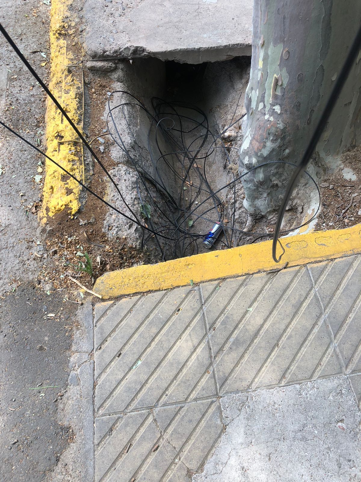 En esta arteria se están realizando trabajos de cableado que aún no han culminado, por lo que se pueden ver varios cables sueltos en plena vía pública.