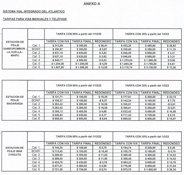 El marzo del año que viene, según lo estipulado en los anexos de la normativa publicada esta semana en el Boletín Oficial, el Sistema Vial Integrado del Atlántico sumará otro incremento, de 35%.
